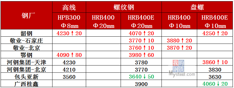 今日,全国4家建筑钢材生产企业上调出厂价10-80元/吨。