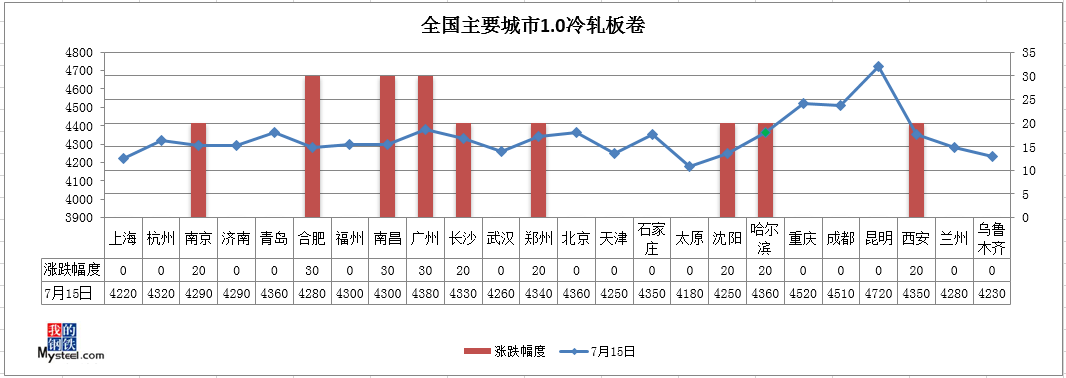 冷轧板卷:今日全国冷轧板卷现货价格持续上行。全国均价4335元/吨,环比上一交易日涨9元/吨,其中上海价格为4220元/吨,乐从价格为4380元/吨,天津价格为4250元/吨。近期市场库存偏低,钢厂到货偏少,商户多挺价运行;从当前基本面看,供给端产量有所释放,但是整体压力并不大,社库持续下降;在价格持续坚挺同时,贸易商互相补货情绪渐浓,恐高心态尚存,钢厂新订单偏少,下游企业多按需采购;南北价差严重分化,北材难下;7月大部分钢厂结算或超预期高,贸易商多涨价惜售,以弥补资源倒挂损失。综合来看,预计明日全国冷轧市场震荡上行为主。