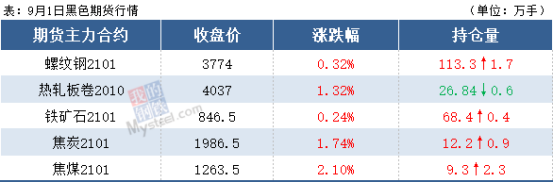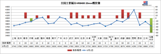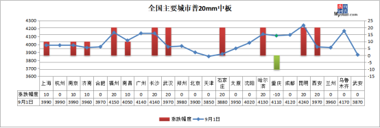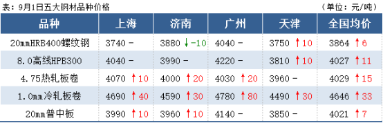 中厚板:9月1日,全国24个主要城市20mm普板均价4021元/吨,较上个交易日价格上涨7元/吨。今日期货继续高位震荡,“唐尔街”限产消息持续发酵,带动现货价格小幅上调,但今日市场整体成交有所收缩,高价成交乏力,低价成交表现一般。资源方面,近期部分钢厂投放量及规格有所增加,但社库压力仍较大。综合来看,预计明日国内中厚板价格或将高位盘整运行。