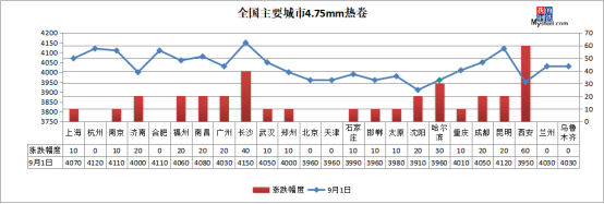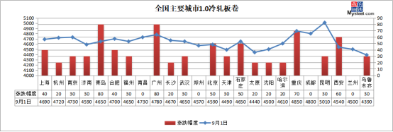热轧板卷:9月1日,全国24个主要城市4.75mm热轧板卷均价4029元/吨,较上个交易日上涨15元/吨。今日黑色商品期货市场大幅上涨,现货市场心态比较乐观,商家报价小幅拉涨,不过涨后高位成交比较乏力,低位成交尚可。当前终端用户基本还是按需采购,投机需求询价较多,但考虑到目前价格已处于高位,补货积极性不高。目前市场恐高情绪加重,商家操作上仍以出货为主,价格上涨略显乏力,不过考虑成本的支撑,价格下跌的可能性不大。预计明日全国热轧板卷价格或将震荡运行。